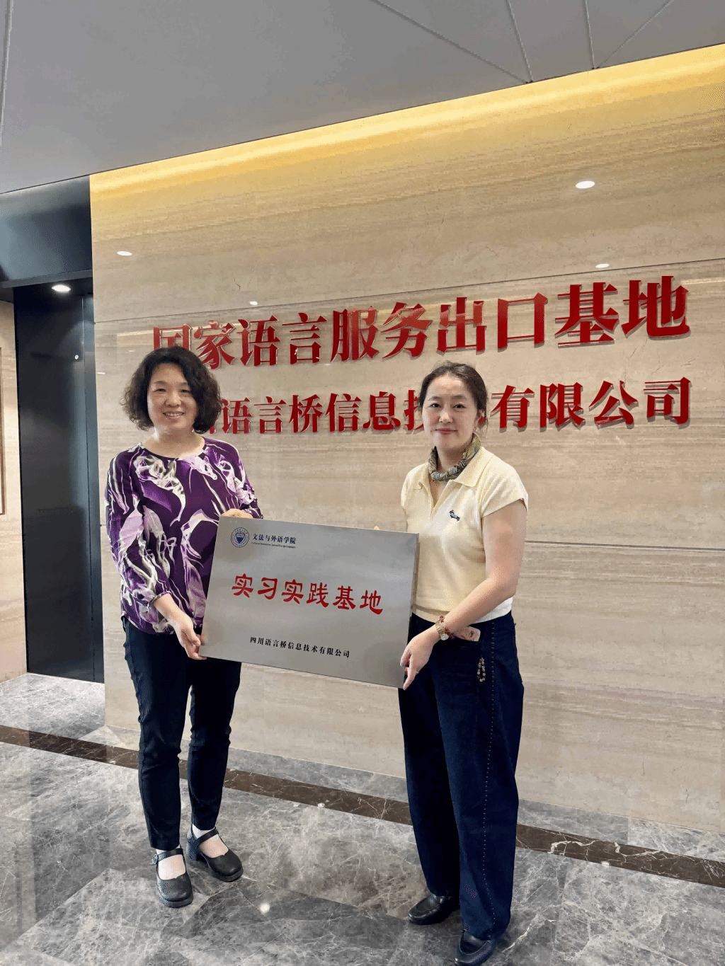 公司代表团第三站来到国家语言服务出口基地——四川语言桥信息技术有限公司,了解其作为国内外语服务龙头企业的业务分布与服务模式。代表团体验了其最新“AI系统”与“专家系统”协同服务模式,段荣娟经理、张海燕副经理介绍了公司MTI翻译硕士专业的教学与科研成果,双方就产教深度融合、聘请行业导师、共建实习实践基地等方面达成共识,并举行实习基地授牌,确立后续合作方向。