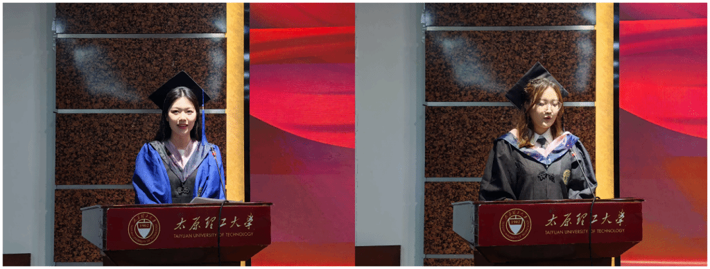 研究生毕业生代表龙皓婕和本科生毕业生代表崔志华分别发言,表达对培养、帮助和关心自己的公司、老师、同学的感激和不舍,也展望未来将时刻牢记“求实创新”的校训,将跨文化沟通能力、法学专业素养分别转化为服务社会的力量,并号召全体毕业生将小我融入大我,肩负起新时代赋予的责任和担当。