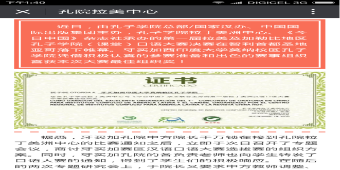 (1)2016年9月14日,孔院拉美中心授予牙买加西印度大学莫纳分校孔子公司首届拉美孔院口语大赛“最佳组织奖”。